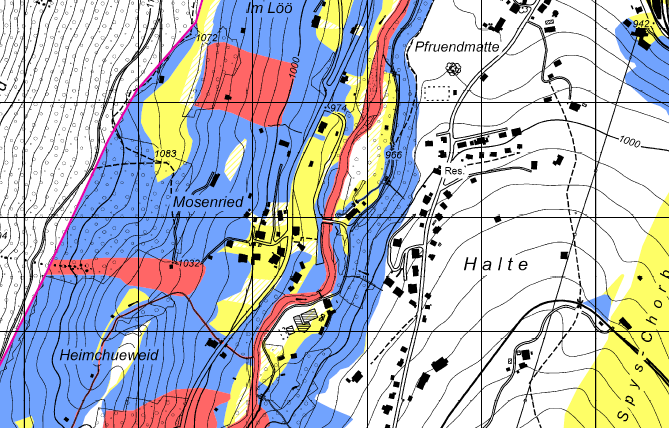 Das gelb-weiss gestreifte Gebiet ist ein Hinweisbereich, der eine Restgefährdung aufzeigt. Das Gebiet ist bei sehr seltenen Ereignissen betroffen oder wenn Schutzbauten die ihnen zugedachte Funktion nicht erfüllen.